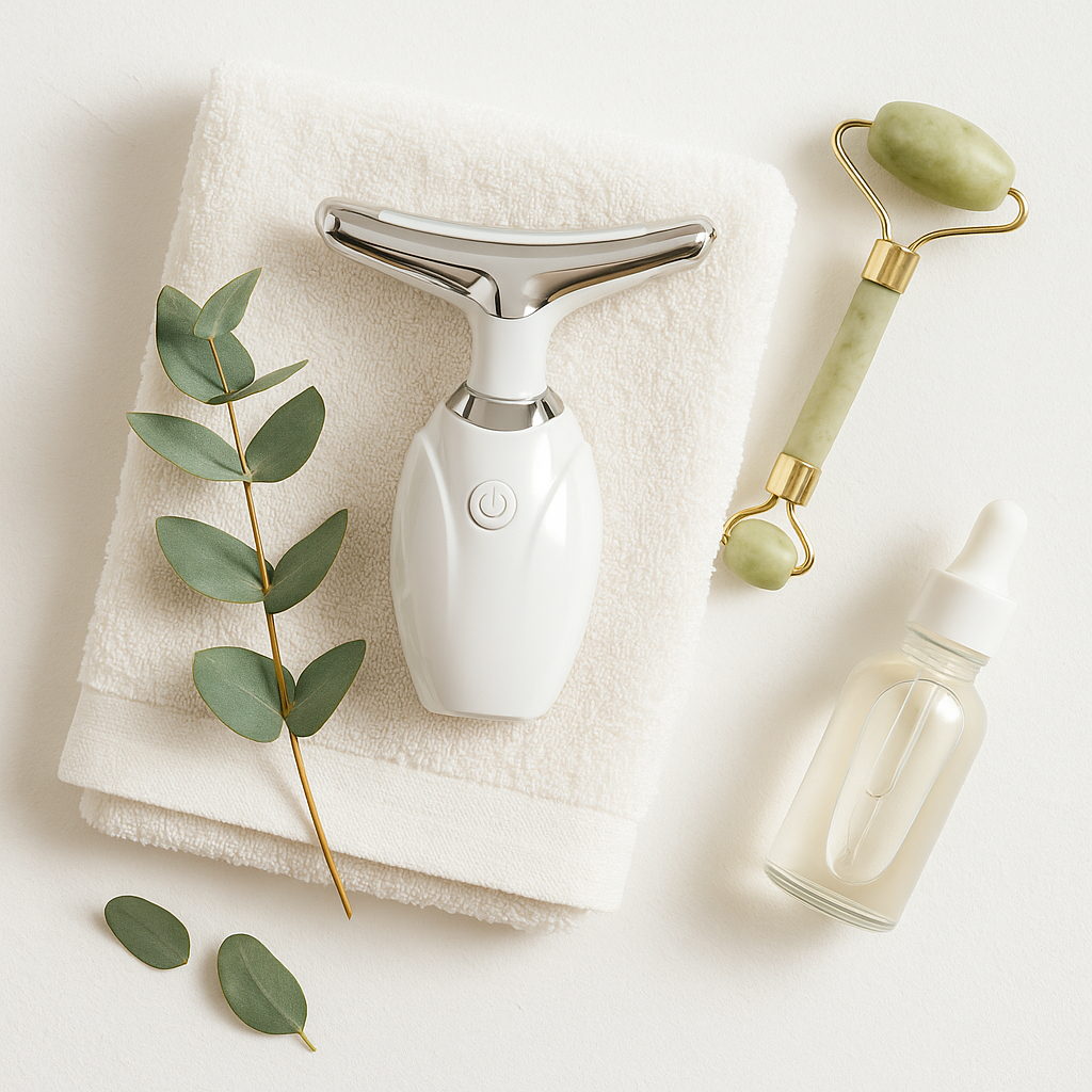 Apply your favorite serum or moisturizer, then glide the device gently along your face, neck, and jawline for 5–10 minutes daily. Use upward motions for best results.